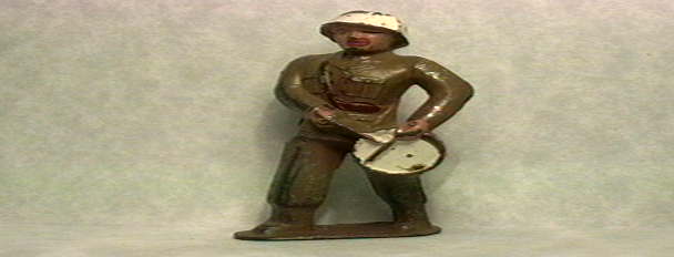 This guy is real cute. Some have white leggings (puttees, leg wraps, whatever), but he doesn't. At the moment he's gone AWOL, so I'll have to describe him from memory. Don't worry, he was here to have his picture taken about an hour ago. If you send money Vern will find him! He's good overall, the worst wear is on his white helmet and his legs. About 80% to 85% paint maybe, he doesn't stand too good. When they changed the helmet it must have unbalanced him somehow. He'll cost you $30.00.