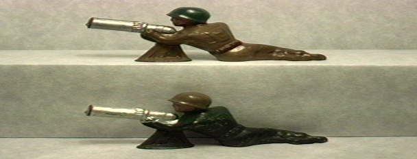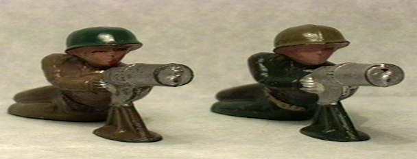 They really are cute, I think they might be twins. Ed and Fred! Yes, As always Ed has the nice neat uniform. He's in Khaki and has most of his paint, while Fred (as always) is missing some of his. He is dressed in the rarer green though, so he thinks that makes him just as valuable. Soldier, Machine Gunner, Lying Flat is their official title. Their official Vernster price is $18.00 each one.