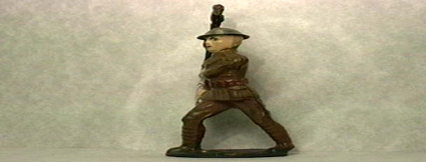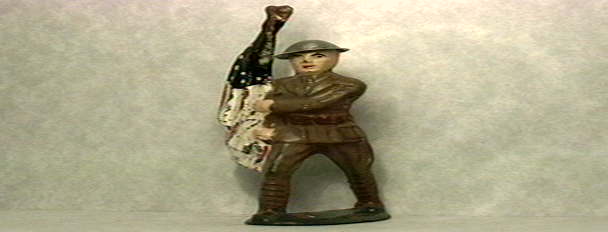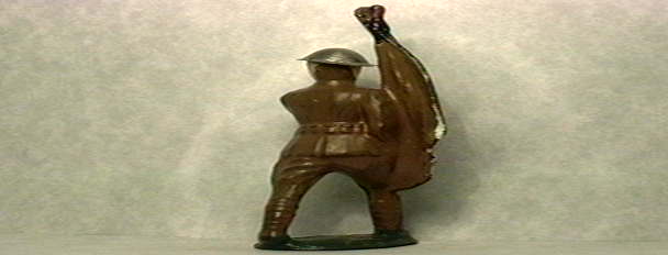 This guy looks to be original except that the flag has been retouched. His face and hands are very pale but so is the tan of his uniform in the front, so I'm thinking he's just faded. The tan in the back is the good old yellowish khaki it should be. His tin helmet looks original too. You must have one for your little parades now, you know you need him! $19.00.