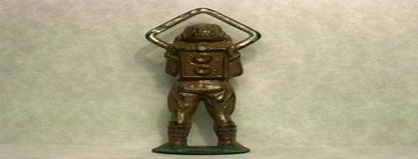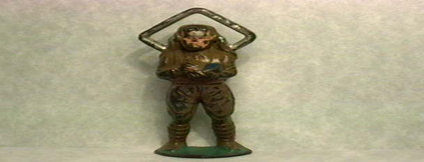 This guy is really pretty rare with the antenna still on his shoulders. He's not in the best paint, but he's so rare you just might need one. He has about 70% paint, the antenna is real good, silver and still shiny, he's writing in a little blue book. There is USA and the number "2" cast into the radio on his back. He's a fantastic $50.