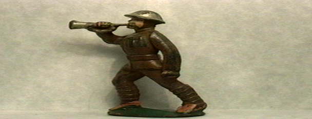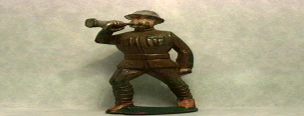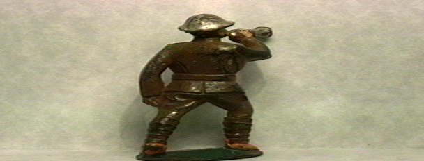 Vern says this is the Boogie Woogie Bugle Boy of Company D. I'm not so sure. He's an ok dude. He has a little chip out of his base which is the solid cast later model. His paint is somewhere around 70%. He has a real cute expression, looks almost like he's about to explode! Anyway look him over, he's $16.00 (and as always that includes postage/handling/whatnot)