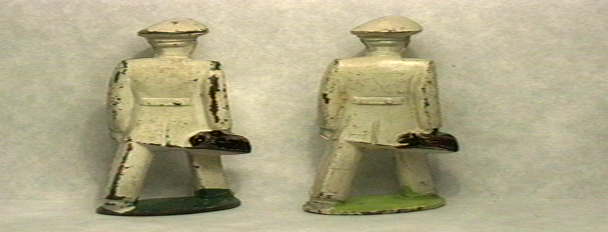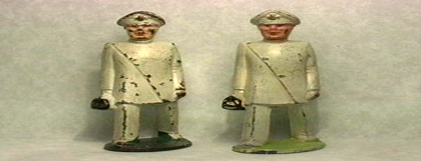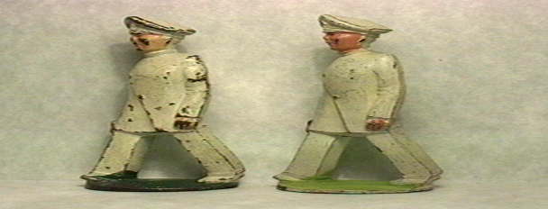 Yes, it's Ed and Fred. This is from their in-between war Hollywood days. You will notice that one guy is not too bad, but one guy is just plain really good. Yes folks, he really is exceptional for a Manoil White Doctor. His base is light green, not the medium or dark. His buttons are gold and so is the cross on his hat. The other guys buttons are kinda maybe yes they were gold too, but his hat had a red cross. His base is the usual green. Anyway, the one with more wear and he's still about 90% to 95% will cost you $22, but the really pretty one is $30.00.