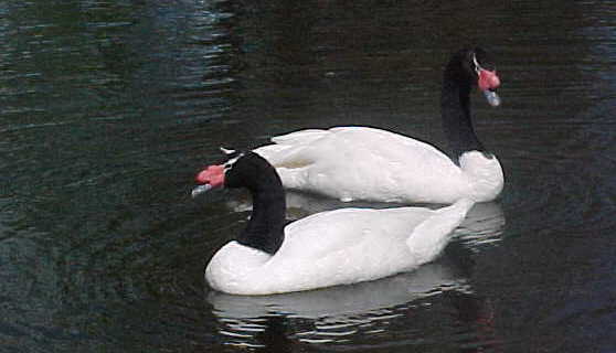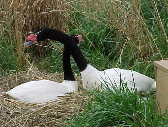 The Blackneck Swan is the most aquatic of the swans, rarely leaving the water except to eat and nest. Males are larger in size and weight than females, and have a larger knob and tend to be more agressive. They are native to South America, and need to have open water all winter to keep them healthy. Fresh water is essential for keeping blacknecks strong and in breeding condition, making them somewhat uncommon in collections. My blackneck pair has bred already this year, producing 5 strong cygnets. Currently they are intrested in the nesting material once again, so hopefully they will double clutch soon!