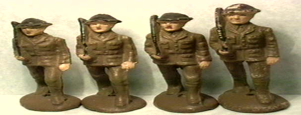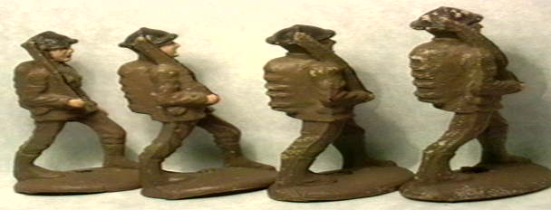 Ed and Fred and Ned and Jed here just marching along from WWI. If you look closely they are all different and all a little different in size too. The details on the pockets and lapels are where it shows best. They all have dark brown helmets and brown uniforms in pretty good shape. One will cost you $9.00.