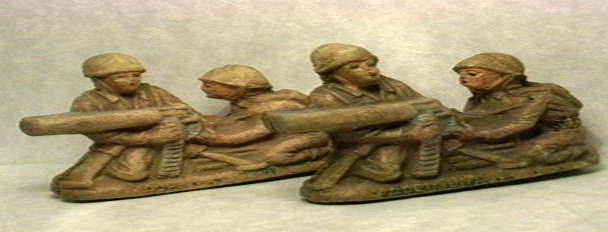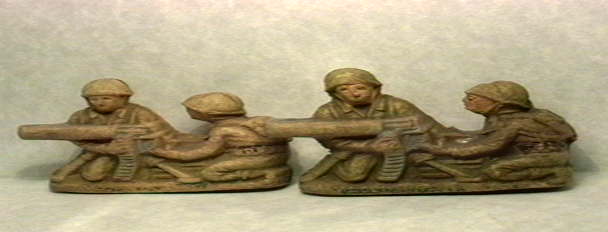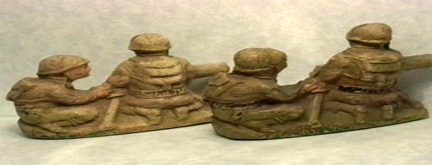 Fred and Ed and Ned and Jed at the old machine gun here. Hey! It's WWII, the Big One as Archie Bunker used to say! They have nothing else to do. Anyway, these are molded figures. There is some separation in the helmet of the guy next to the barrel. Also some on the ends of both figures. One has separation on the base, the other on the barrel. They both have markings on the base but only one seems to have 403. Both have different color brown paint. Hardly any silver and green left. Faces are not bad. Either one will cost ya $7.00 or take them both for $12.00.