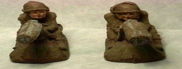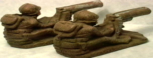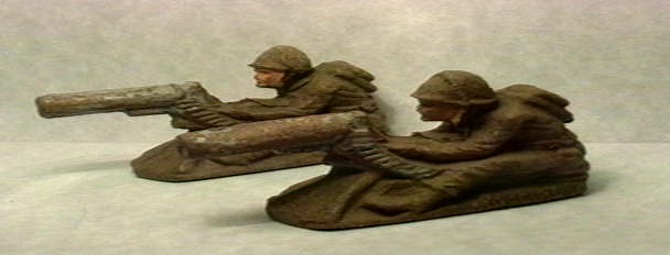 Once again it's Ed and Fred; happily manning their little ole WWII machine guns. Ed and Fred fought in both wars, in between they were actors in hollywood westerns. They played indians and cowboys. Anyway, here they are up for grabs. Each one is a little different. There's some gun metal gray paint left on each barrel, but not a lot. The guy with the smaller helmet has tiny beginnings of separation on the end. His gun barrel is longer and thinner than the other guys. Either guy will cost you $8.00