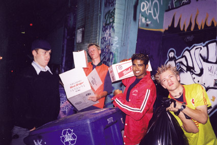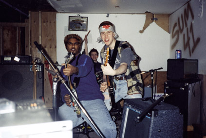 Sum 41 in the early days. This might have been taken during a time when they didn't have a base player. Dave is playing guitar, Deryck at the drums and that other guy with the guitar may be steve.
