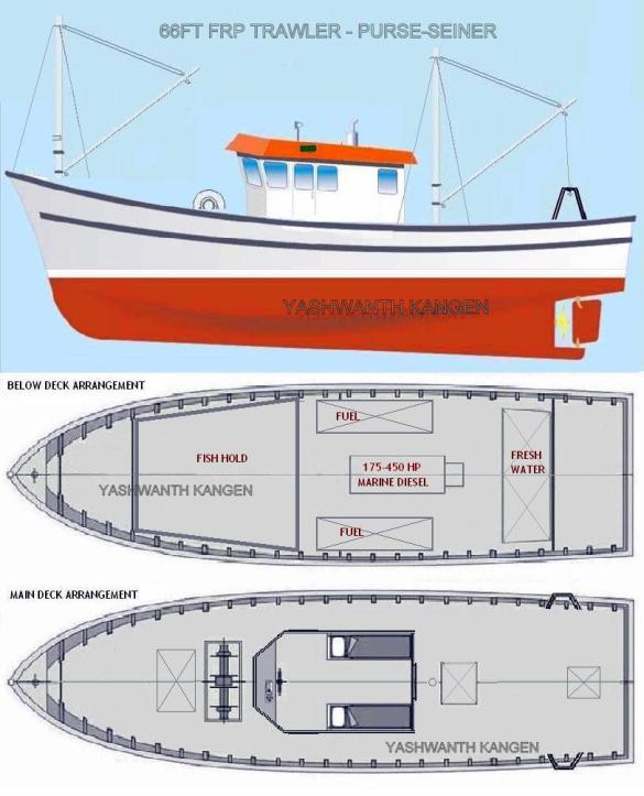 Basic Specifications: Length: 66', Beam: 19.5', Displacement: 40 m.tons(empty), 70 m.tons(fully loaded), Fuel oil cap: 12 KL, Freshwater cap: 5 KL, Fishhold: 40 Cu.Mt PU-Foam insulated & FRP lined, Winch: Triple drum mechanical/hydraulic drive, Crew accommodation for eight, Electronic equipment include echo-sounder, VHF radio-telephone and GPS, Engine: 175-450hp marine diesel (or owner's choice) Construction: Fibreglass Reinforced Plastic hull made by contact moulding process. Longitudinal and transverse stiffeners and structural bulkheads provided.