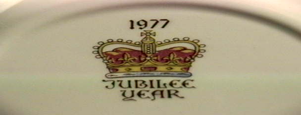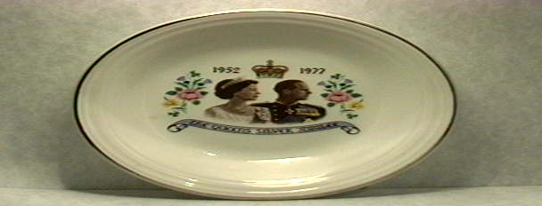 This is a nice little dish from the 1977 Silver Jubilee Celebration for Queen Elizabeth II. It also has the handsome and charming Prince Phillip on it. It measures about 5 1/2" across and is fairly deep for this type thing. It is a bit over 1" deep. The back has no maker's mark but has a crown and says 1977 Jubilee Year. There is a discoloration on one side on the back. It is under the glaze and visible in the pictures below. The dashing royal couple can be yours for $20.00.