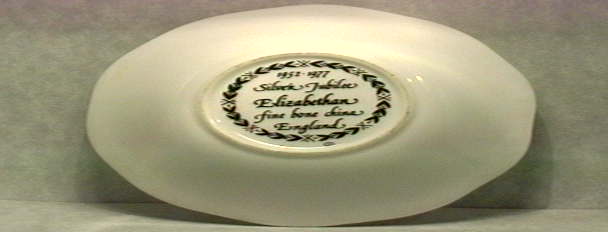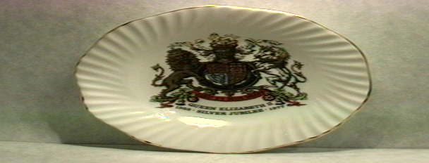 This little commemmorative dish measures just about 4 3/4" across. It is white with rays and a little scallop on the edge. Beautiful emblem in the center with gold gilt on the royal crest. Also gold edge. Back is marked 1952-1977 Silver Jubilee Elizabethan fine bone china England. There is also a small 6 outside the wreath around the backmark. No breaks, cracks or repairs. $20.00.