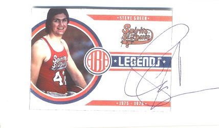 Steve Green (Forward played at Indiana University where he was coach Bob Knight's first recruit in 1971. He played in the ABA (1975-76) for the Utah Stars & Spirits of St. Louis. He also competed in the NBA for the Pacers and signed in 7 months) rec'd 07-09-14
