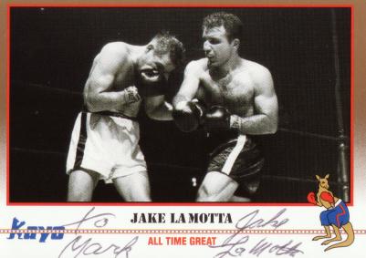 Jake LaMotta (One of the toughest boxers in the history of the sport, he turned to pro boxing in 1941 at the age of 19. He was the first man to beat "Sugar" Ray Robinson, and went on to defeat Marcel Cerdan for the middleweight championship, held the crown for two years before succumbing to Sugar Ray Robinson in 1951. His career record was 83 wins, 19 losses, and four draws upon his retirement in 1954. He signed my card in 2003 and passed away on September 19, 2017)