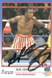 Sugar Ray Leonard (Retired boxing great was a World Champion in five different weight classes with his biggest wins over Marvin Hagler, Thomas Hearns and Roberto Duran. In addition he was a gold medal winner in the 1976 Olympics. *****At this point I can't be certain this is a real signature. Instead, I feel this is either a stamp or autopen, if anyone has ever had a success with him please let me know. He signed my boxing card in 34 weeks) rec`d 12-15-01