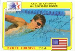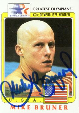 Mike Bruner (Won two gold medals at the 1976 Montreal Olympics. Bruner has made history in the 200 meter butter when he won the event in world record time. Also, he swam the opening leg of the 800 meter freestyle relay team for his second gold. He signed my card in 17 days) rec`d 2-25-02