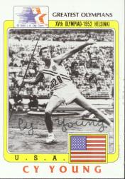 Cy Young (The first and only American to ever win a gold medal in the javelin competition. This took place during the 1952 Helsinki Olympics. He signed my card in 2002 and he passed away on December 6, 2017)