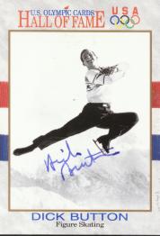 Dick Button (He won five consecutive world championships in figure skating. In 1948 he won the gold medal in the Olympic Winter Games in St. Moritz with maneuvers never attempted by other skaters. He also won a second gold medal in the 1952 Oslo Olympic Winter Games in the mens singles figure skating. He signed my card in 6 months c/o Candid Productions) rec`d 09-04-01