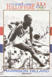 Harrison Dillard (Won two Gold Medals in 1948 at the London Olympic Games in the 100 meters and 4x100 meter relay. He then won another two Gold Medals at the 1952 Helsinki Olympic Games in the 110 meter hurdles and the 4x100 meter relay. Mr. Dillard signed my card in 12 days) rec`d 1-18-01
