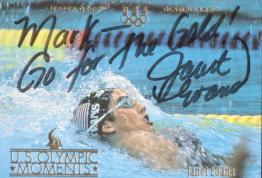Janet Evans (One of the stars of the 1988 Seoul Olympics, winning gold medals in the 400- and 800-meter freestyle events and the 400-meter individual medley. Her time of 4:03.85 in the 400-meter freestyle was a world record. At the 1992 Olympics, Evans claimed two more medals, a gold in the 800-meter freestyle and a silver in the 400-meter. She signed my card in 9 weeks) rec`d 05-05-01