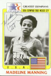 Alice Coachman (Was the first African-American woman to win an Olympic gold medal and the only American woman to win a gold medal in the 1948 Olympics in London. Her event was the high jump and she also won 25 national titles, mainly for the high jump. Although she failed to sign by sports card she instead signed an index card in 3 weeks) rec`d 1-3-03
