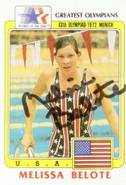 Melissa Belote (Broke the world record in the 200 meter backstroke enroute to winning her third gold medal in the 1972 Munich Olympics. She also won the 100 meter backstroke and swam a leg on the winning medley relay team gold medals. She signed my card in 11 weeks) rec`d 4-27-02