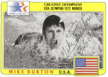 Mike Burton (Won 3 Olympic gold medals, two came in the 1968 Mexico City Olympic Games in the 400 meter and 1500 meter freestyles and one in 1972 Munich Olympics for the 1500 meter freestyle. In addition he set 7 world records during his career and was inducted into the International Swimming Hall of Fame in 1977. He singed my card in 10 days)