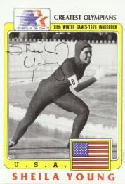 Shelia Young (First U.S. athlete to win 3 medals at a Winter Olympics (1976 Innsbruck), won a gold medal in the 500 meter speed skating event, silver medal in the 1500 meter & bronze medal in the 1000 meter event. She signed my card in 1 month) rec`d 4-11-02