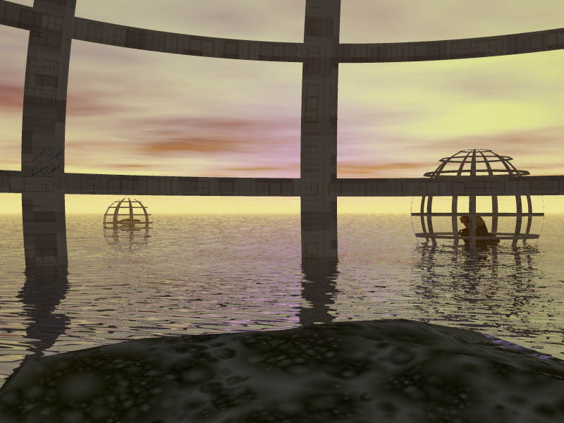 Metalloid cages dot a water-like body of liquid. True, you could get out, but where would you go?
