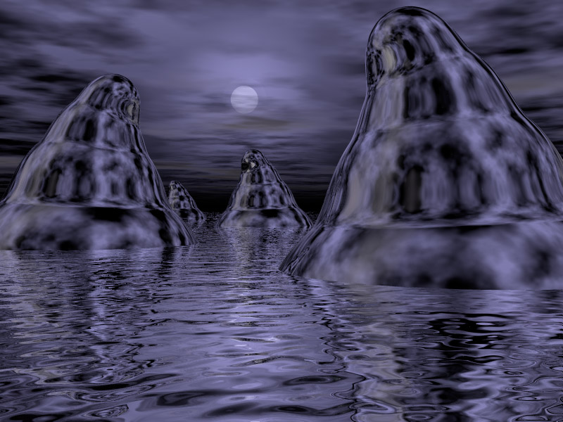 This gooey space ship took hours upon hours to render, due to the extensive usage of light, refraction, transparency, reflection, and blobs of sticky Metaballs.