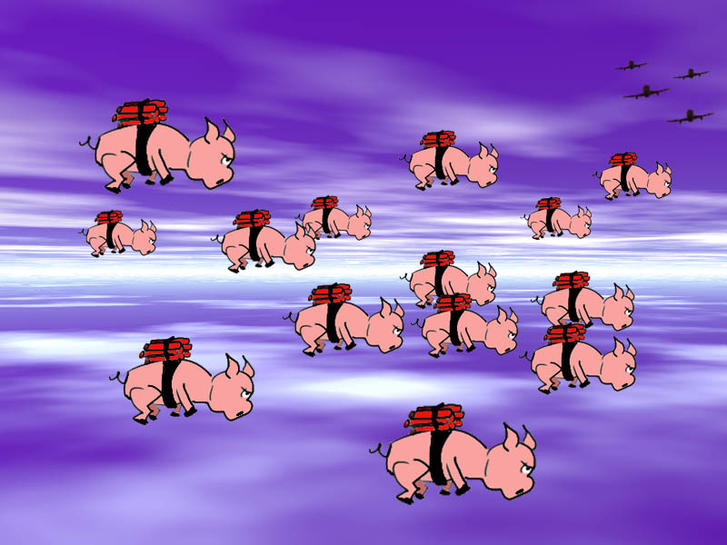 Alan gave me this idea: to have pigs strapped with TNT dropped from cargo planes. You may ask, though, "Where are the cargo planes?" Well, if you asked me that I'd have to tell you that they are in the upper right hand corner. They're tiny for a reason; it's hard to find good quality cargo planes anymore.