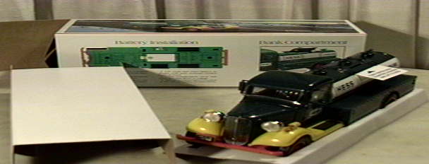 This is a nice clean unplayed with Hess Truck. This is the one that is exactly like the 1982/83 Non Bank Truck. Both came in boxes that say "The First Hess Truck." That means the first Hess Tank Truck that Amerada Hess used. The first TOY Hess Truck was made in 1964 by Louis Marx. It is a Mack B Tanker. The box is clean and the cardboard inserts are white and in good condition. There are a few surface tears on the top of the box (visible in pictures) where somebody taped a bow, or tag or both. There is some yellowing on the box edges and across one flap. ENOUGH OF THE BOX FOR HEAVEN'S SAKE, THE TRUCK ITSELF IS FABULOUS AND MINT!!!! THE SWITCH IS RED. MADE IN HONG KONG. Yours for $80.00.