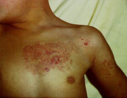 Elle favorise la surinfection. Un traitement local est nécessaire et consiste à l'application de compresses imbibées de sérum physiologique, suivie de l'application d'un onguent antibiotique et d'un pansement non adhésif (tulle gras). En cas de survenue d'une infection grave (cellulite).