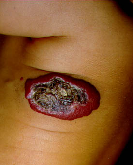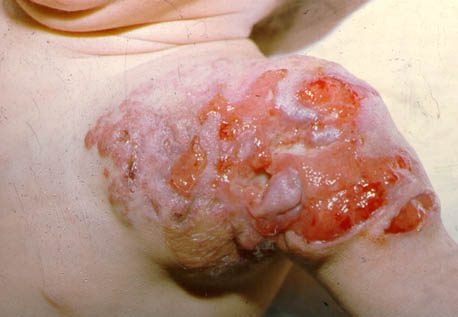Elle est souvent une complication de l'ulcération mais elle peut parfois survenir de façon primaire en particulier à la région anale ou périorale (7,51,128).