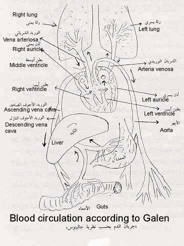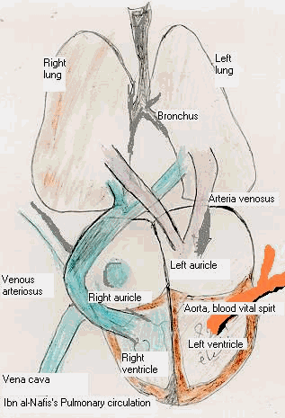 Physicians in the Middle Ages in Islamic culture, followed Galen’s teaching in anatomy blindly. Till some physicians like Al Bougdadi and Ibn al-Nafis criticized and challenge it. Galen and Avicenna after him considered the right heart in communication with left side of the heart with invisible pores. So the blood from the right side of the heart goes through these invisible pores in the septum of the heart to the left side where it mixes with air to create spirit and then is distributed to the body. Accordingly the venous blood side is quite separate from the arterial system, except when they come in contact by the unseen pores.[5-8] Ibn al-Nafis said "…the blood from the right chamber of the heart must arrive at the left chamber. But there is no direct pathway between both chambers. The thick septum of the heart is not perforated and does not have visible pores as some people thought or invisible pores as Galen thought. The blood from the right chamber must flow through the vena arteriosa (pulmonary artery) to the lungs, spread through its substances, be mingled there with air, pass through the arteria venosa (pulmonary vein) to reach the left chamber of the heart and there form the vital spirit…"