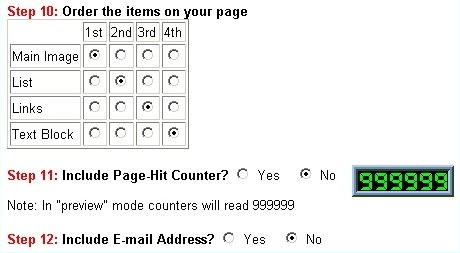 At the bottom of the editor Steps 10 to 12 you can decide which section of the page shows at the top of the page and which part show at the bottom, add a counter or show your e-mail.