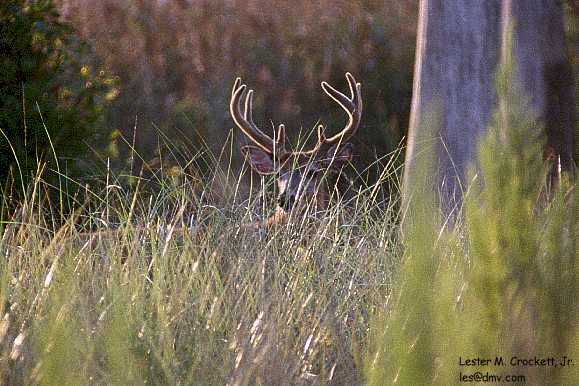 I give my wife credit for this shot. She saw the deer and pointed it out to me. It's a handsome specimen to, sporting its new rack of velvet-covered antlers. I took the shot while driving along the wildlife drive at Assateague, Virginia. I used a Pentax PZ-1P SLR camera mated with a Tokina 80-200 mm autofocus zoom lens. The exposure was on Kodak MAX 400 film. No camera settings were recorded. Click here to see a larger image displayed in a new browser window. There are other images of sunsets , and other scenic images as well, located on the screen saver page.