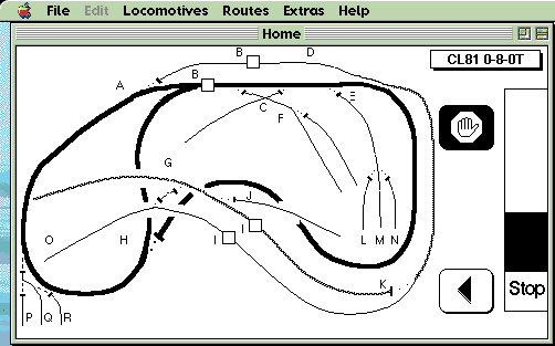 Switches can be thrown by simply clicking on the schematic or by hitting the appropriate key on the keyboard or remote control. Entire preprogrammed routes can be set by one menu selection. The speed characteristics of each locomotive can be configured.