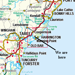 It is set in bushland 6 km from the sea side resort of Harrington about 3.5 hours travel north of Sydney