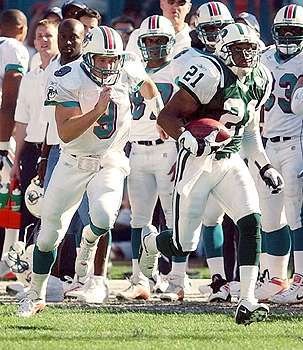 Jets' cornerback, Victor Green runs back Jay Fiedler's INT 63 yards for the second INT TD of the day. Fiedler tries, but does not succeed in running him down.