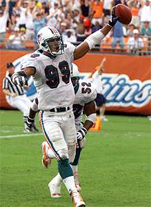 Jason Taylor celebrates after picking up a fumbled snap by the Patriots' QB, Tom Brady, and returning it 1 yard for the score.