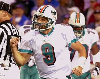 Jay Fiedler celebrates a 4th quarter touchdown pass against the Bills, in Buffalo.