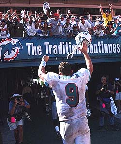 Jay Fiedler gets cheered on by the Dolfans while exiting to the locker room after winning the game 18-15 against Oakland on a 2 yard run with :05 remaining.