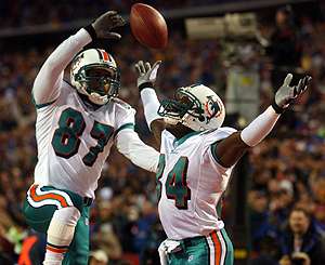 Chris Chambers celebrates his winning 29 yard touchdown grab in the 4th quarter (his second of the game and the quarter) with fellow receiver, Dedric Ward.
