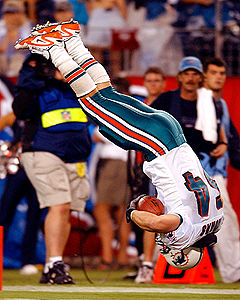 Zach Thomas does a summersault into the endzone after picking off a Neil O'Donell pass and returning it for the score in the opener at Tennessee.