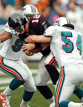 Zach Thomas hauls down Atlanta QB, Chris Chandler on the first play of the game against the Falcons. This would be the first play of a huge defensive day for the Dolphins.