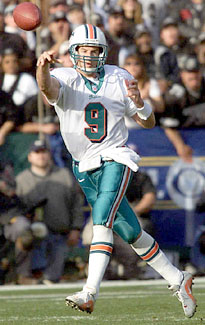 Jay Fiedler is most dangerous when he is forced out of the pocket. Here he finds an open receiver while throwing on the run.