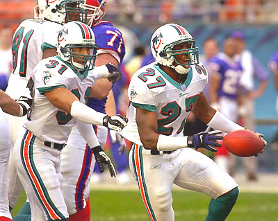 Arturo Freeman celebrates after picking off an Alex Van Pelt pass in the final game of the 2001 regular season at home againt the Bills.