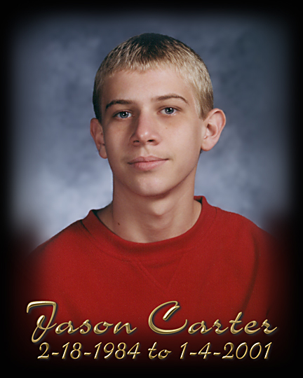 Jason Carter was killed by an uninsured, unregistered driver that told police he had taken a couple of percacets and drank a couple of beers. Jason & a friend Jeremy were walking from Jason's house to Jeremy's house when Greg Riley went off the road, hit 2 telephone poles, a fence, some rocks then Jason. Jason jumped one way while Jeremy jumped another trying to get out of the way of the speeding out of control car. Jason was hit and thrown 78 feet. Jeremy was almost hit by the hood of Greg's car as it flew off. He ended up flat on his belly in the middle of a major road to avoid being hit. Jason had jump towards the cars in a driveway but did not make it. Grey Riley's car went 475 feet before hitting Jason and finally went through another fence and came to rest in a field almost a 100 feet from where he hit Jason. The homeowner and neighbors called 911 immediately. Greg Riley got out of his car, helped his passenger out then ask Jeremy to help him push his car to the road so he could get his car out of there before the cops came. Jeremy of course lost it and ask Greg did he know what he had done. Jeremy also called Jason's mom. She arrived on the scene just after paramedics and police arrived. Greg Riley never showed any concern for Jason or Jeremy, all he cared about was getting out of there. He was so nonchalant that Jason mother who was understandably emotional slapped him twice after asking if he knew what he had done and trying to get him to show some type of emotion. He (Greg) only emotion was to yell to the police do you see what she did to me. You need to arrest her. Jason was taken by ambulance to the hospital where he was declared DOA.