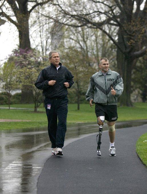 "A PICTURE YOU NEVER LIKELY SEE" Attached is a picture of Mike McNaughton who is in the Army. The person who sent this picture was his best friend and they were privates together in 1990-1994. He stepped on a landmine in Afghanistan Christmas 2002. President Bush came to visit the wounded in the hospital. He told Mike that when he could run a mile, that they would go on a run together. True to his word, he called Mike every month or so to see how he was doing. Well, last week they went on the run, 1 mile with the president. Not something you'll see in the news, but seeing the president taking the time to say thank you to the wounded and to give hope to one of my best friends was one of the greatest/best things I have seen in my life. It almost sounds like a corny email chain letter, but God Bless him.