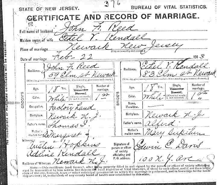 Ethel V. Kendall marriage Certificate. From this record we know they were married on the 22nd of February 1913 in Newark, New