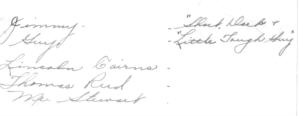 It looks like they might have been working on giving the guys nicknames. Naming them from left to right in the photo: Jimmy- "Short,Dark &", Guy- "Little Tough Guy", Lincoln Cairns, Thomas Reed-, Mr. Stewart.